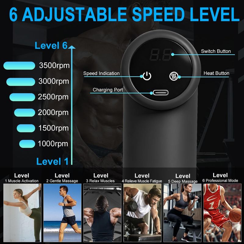 2.【Customizable Speed Levels for Every Need】With 6 adjustable speeds ranging from 2400 to 3200 RPM, this massage gun lets you personalize the intensity for gentle relaxation or deep tissue relief. Perfect for athletes and everyday users, it helps relieve muscle soreness, improve circulation, and promote faster recovery, all with a quiet, brushless motor for a peaceful massage experience.