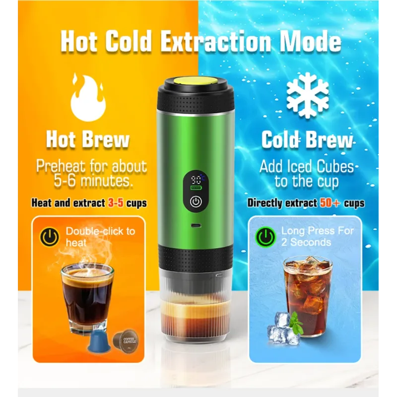 【Intelligent Extraction】Portable espresso machine adopts intelligent heating function, convenient extraction, double-click the power switch, open the heating extraction function, heating extraction. Long press the power switch, directly open the extraction function, convenient operation, suitable for all kinds of hot/cold drinking water.