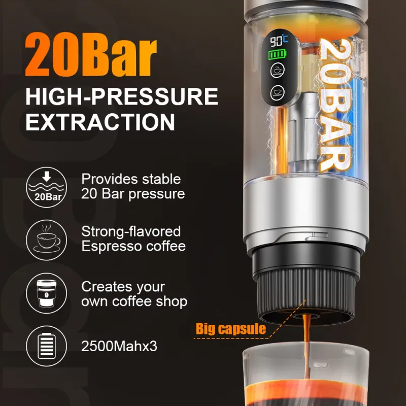 【Multi-compatible】The 3-in-1 portable espresso machine is equipped with a ground coffee compartment and a capsule compartment, which is compatible with small and large capsules and ground coffee.