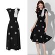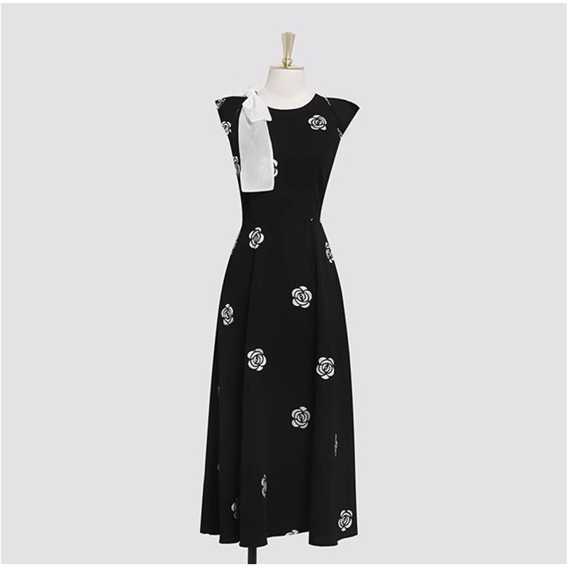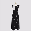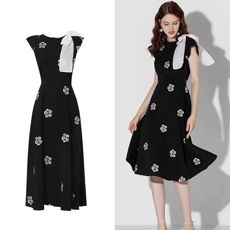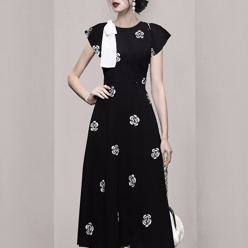 Designer Fashion New Summer Rose Flower Embroidery Office Dress Elegant Women O Neck Hit Color Bowknot Black Floral Midi Dresses