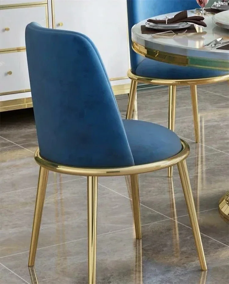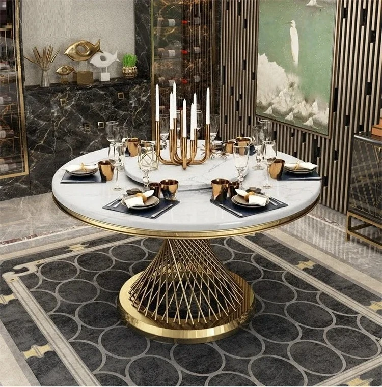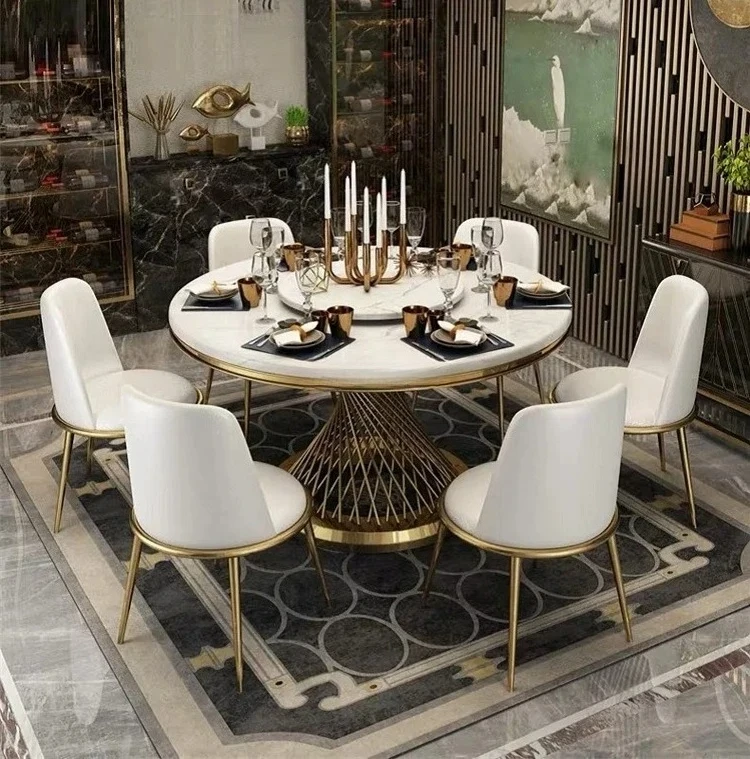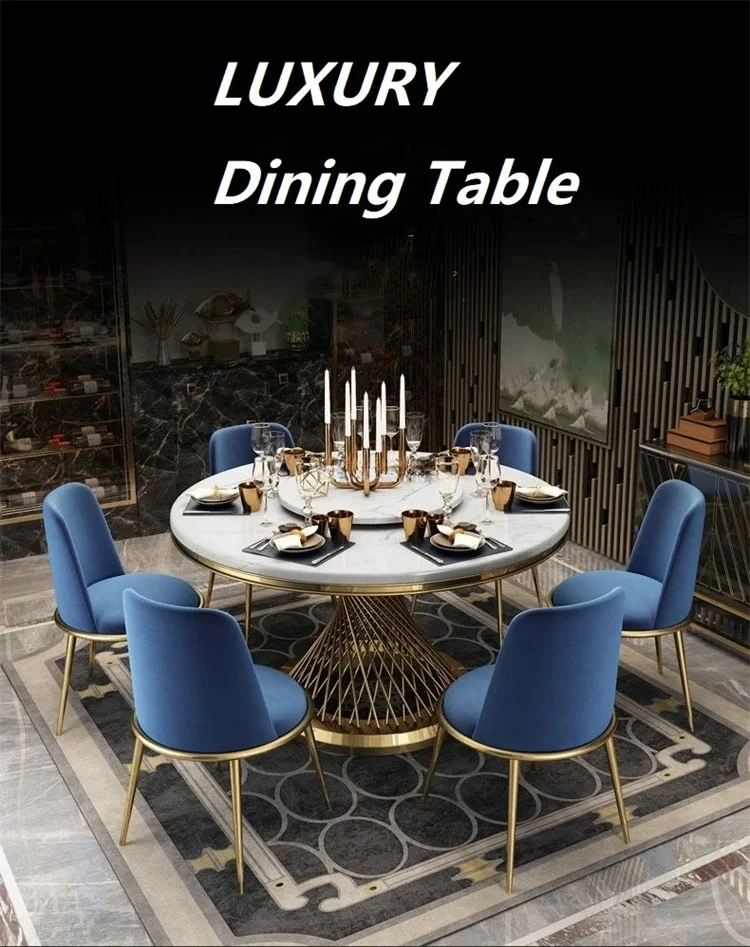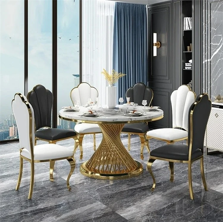Designer Luxury round dinning Marble Rock Slab dining table set 6 chairs mesa comedor sillas furniture Stainless steel gold base