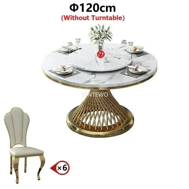 Designer Luxury round dinning Marble Rock Slab dining table set 6 chairs mesa comedor sillas furniture Stainless steel gold base