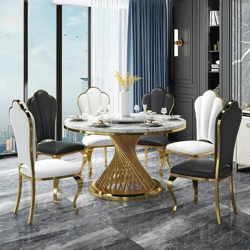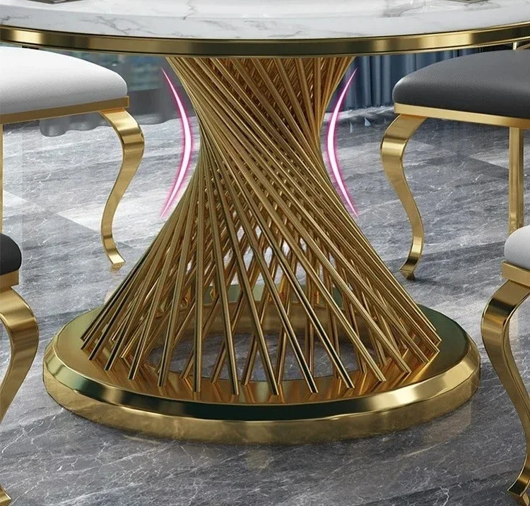 Designer Luxury round dinning Marble Rock Slab dining table set 6 chairs mesa comedor sillas furniture Stainless steel gold base
