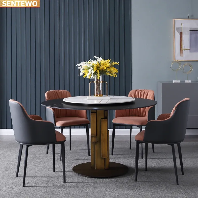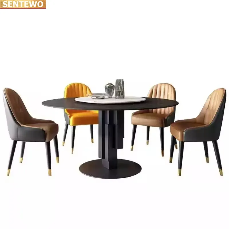 Designer Luxury round Marble Rock Slab dining table set 6 chairs mesa de jantar tablo furniture marbre Stainless steel gold base