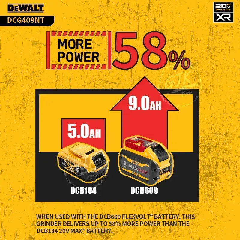 Take advantage of more power using 18V XR tools with FLEXVOLT ADVANTAGE technology. A unique electronic module with pack identification technology enables the tool to recognise when an XR FLEXVOLT battery is attached and unlock even more power. The DCG409 delivers up to 54% more power when paired with a DCB546 XR FLEXVOLT 6Ah battery versus a DCB184 18V XR 5Ah battery. Part of the DEWALT Perform & Protect range, the DCG409 incorporates an integrated Kickback Brake and the Anti-Rotation E-CLUTCH System for enhanced user protection.