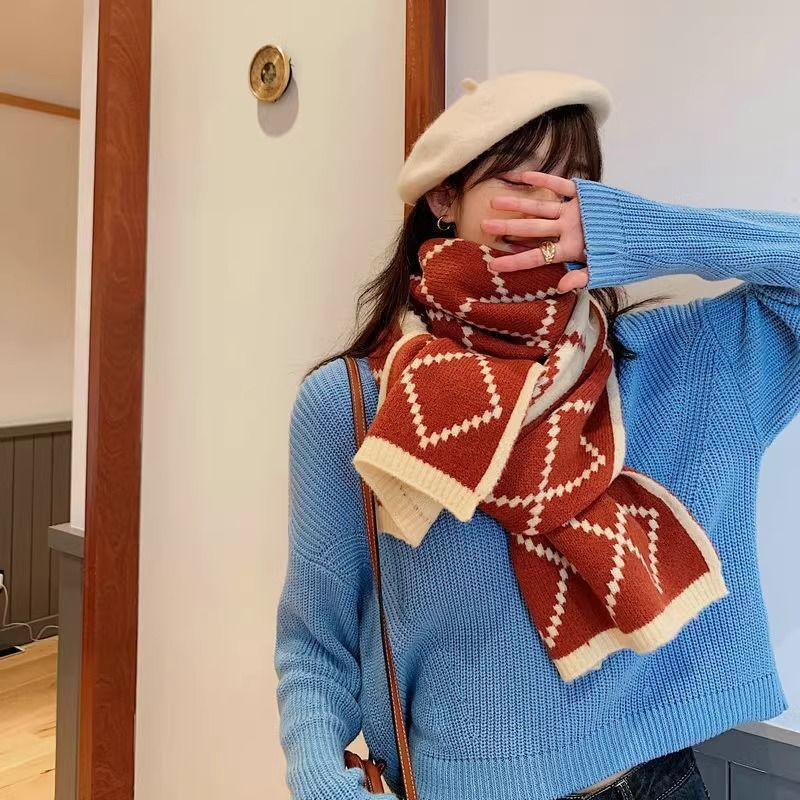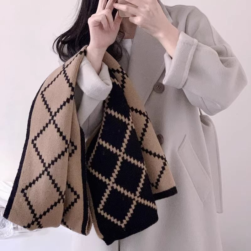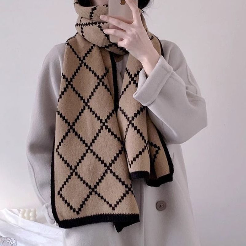 Diamond Plaid Scarf Winter Student Couple Thickened Warm Wool Scarf Khaki 180x30cm