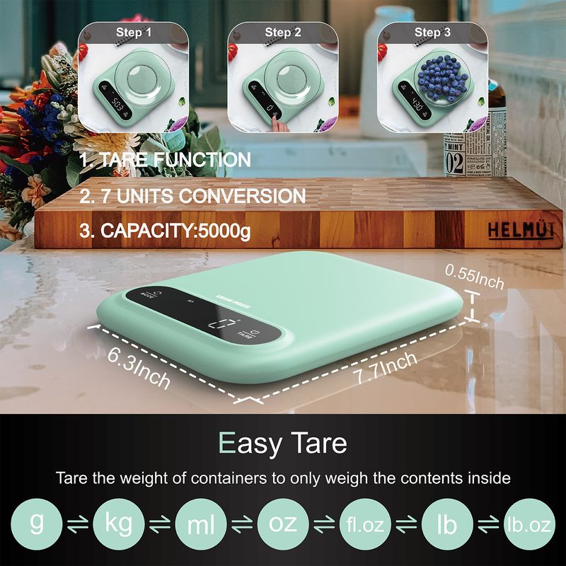 【Easy Unit Conversion】With the press of the MODE and TARE button, effortlessly switch between weighing units (grams,oz,kg,ml,fl.oz,lb,lb:oz)and It can be tare with one click, making this food scales digital weight grams and oz user-friendly for any recipe or diet.
