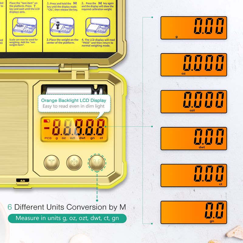 2. Multi-function: g/oz/ozt/dwt/ct/gn fast switching of six units, large LCD backlit display, digital display is larger and easy to read