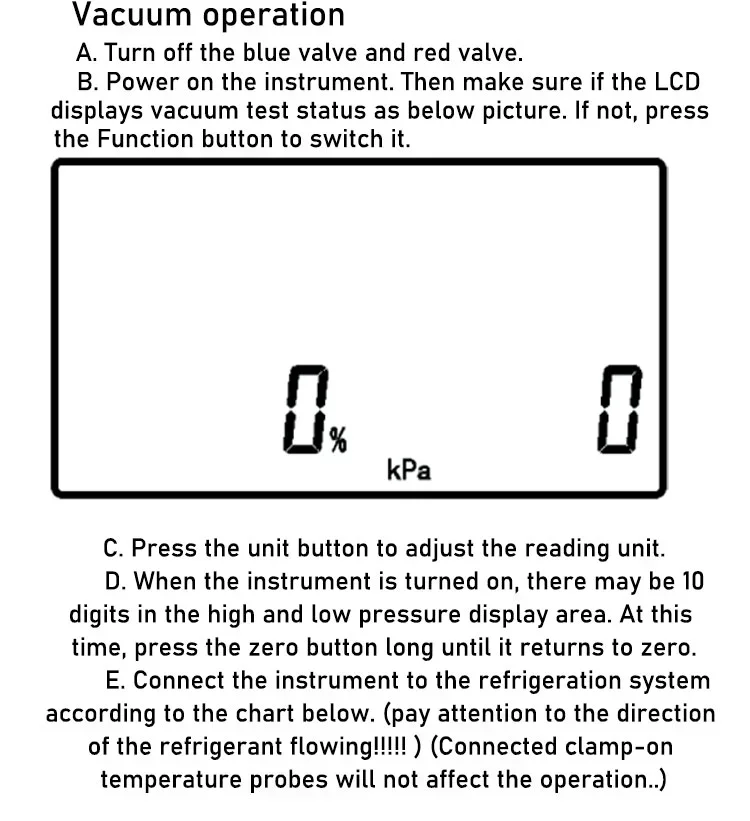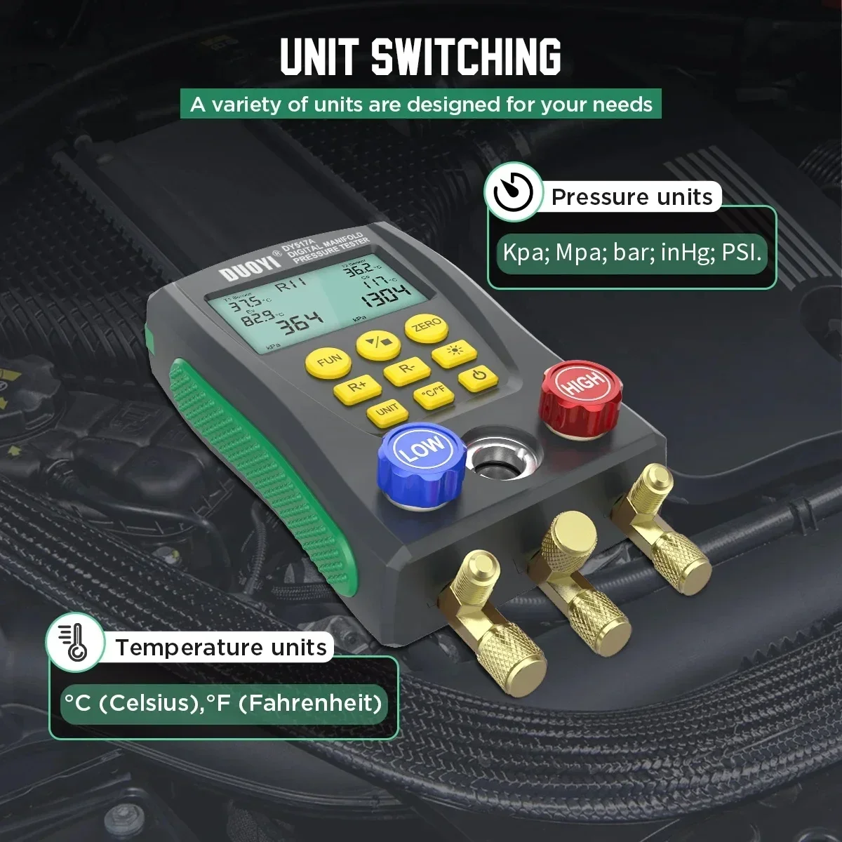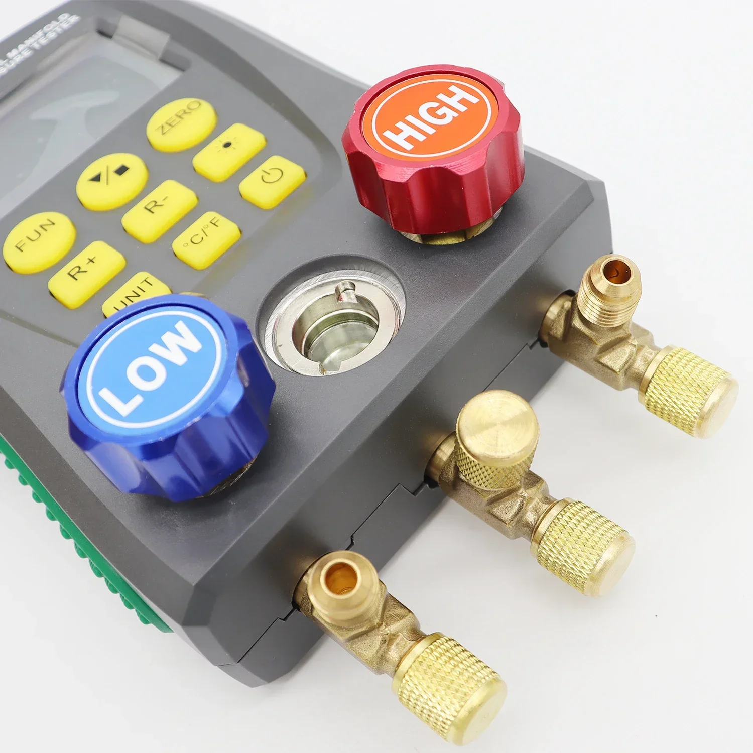 Also it tests percentage of vacuum measurement; pressure leak measurement, leak time speed record. It is deserved to have this multi-functional, accurate and simply operated digital manifold let you do the job right.