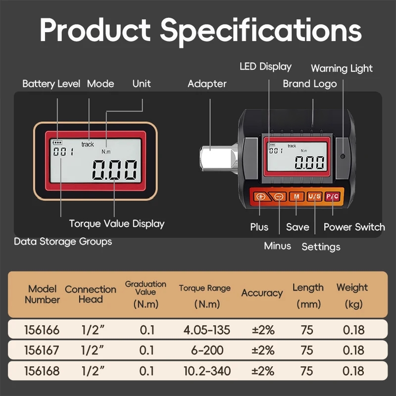 Multiple Torque Units: Switch between kgf.cm, Nm, lbf.ft, and lbf.in with ease, ensuring versatility for various applications.