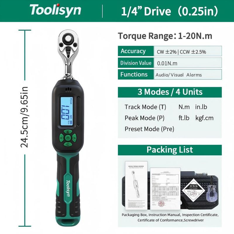 ★Easy to Use:Our lightweight and professionally calibrated digital torque wrenches are engineered with high-quality materials that display real-time torque values in N.m,ft.lb,in.lb,kgf.cm, only need to simply operate the buttons,can clearly see the value conversion between the measurement units,which is more accurate and convenient than a mechanical wrench.Excellent tool for tiny, tight, and narrow working environment, that is ideal for bicycle, motorcycle, car,home or professional, and other industrial uses.