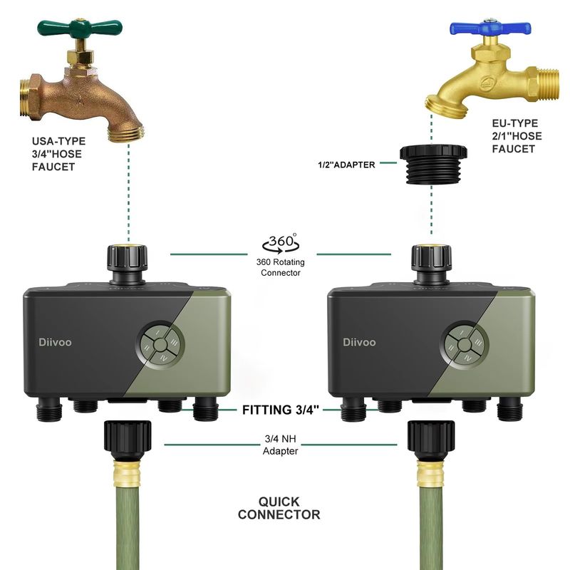 With the HomGar app, you can add your Diivoo smart water timer to your WiFi gateway (only supports 2.4 GHz WiFi). Diivoo smart 4 zone hose timer is compatible with Alexa and Google Assistant to make your life easier by simplifying your irrigation efforts