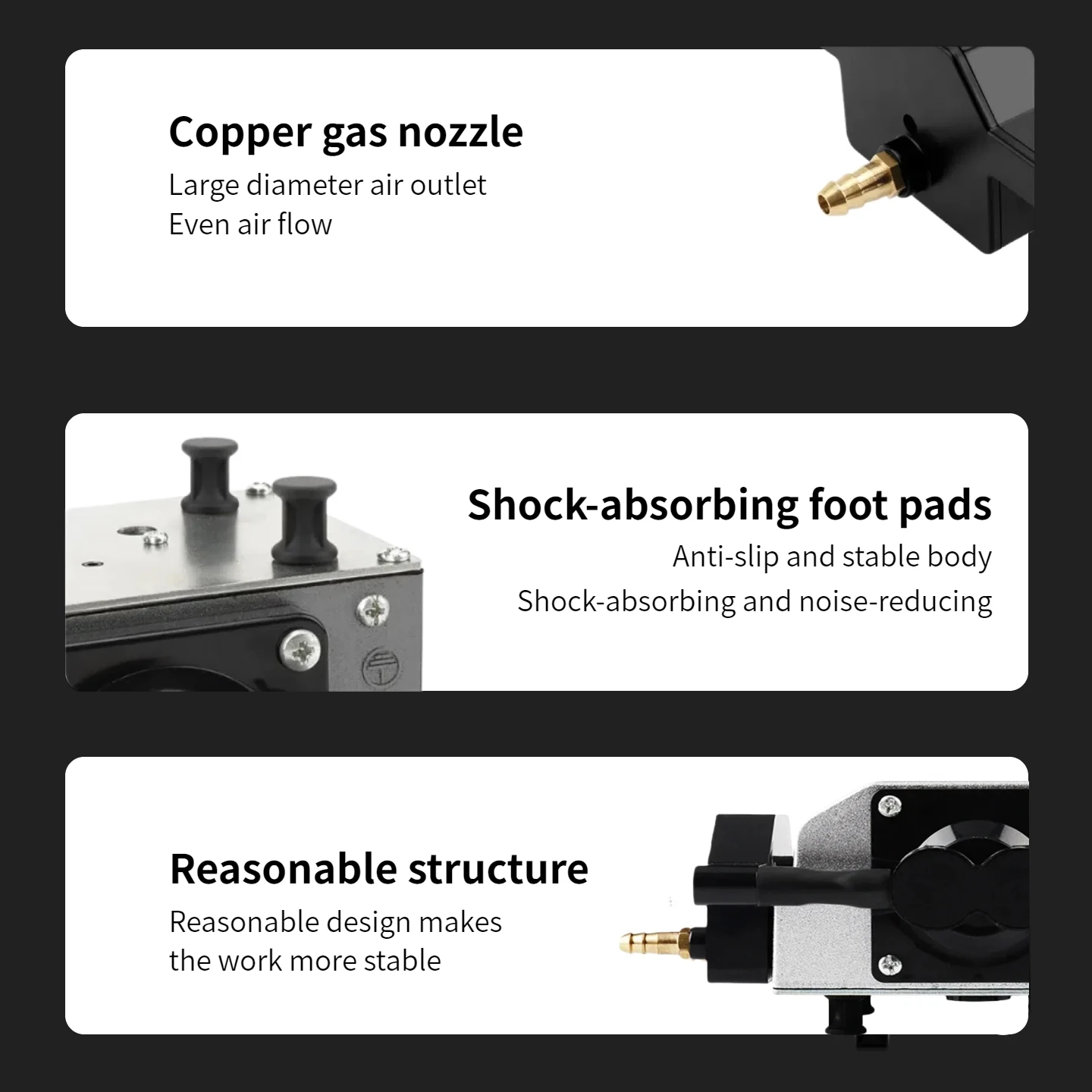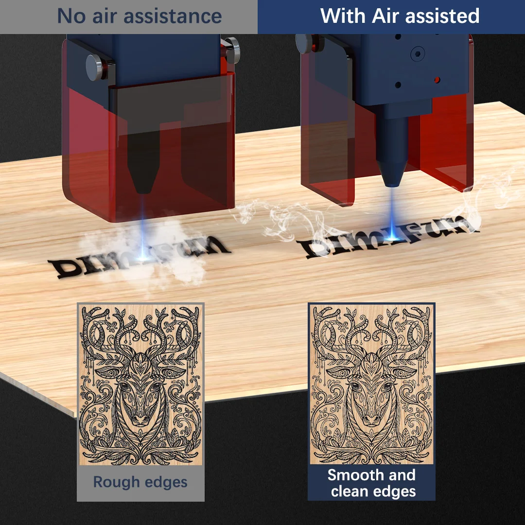 1. Cut faster and deeper: The laser engraving machine is equipped with an air assist device for wood and metal. Large and stable air blows away the smoke and debris generated when the laser engraving machine is working, helping the engraving machine to cut faster and deeper, improve laser efficiency, and save your time. 2. Clean surface and smooth edge: The air assist device uses air to quickly reduce the temperature of the surface of the cutting material, prevent deformation and discoloration caused by high temperature, and ensure smooth lines, complete patterns, and clean material surfaces. 3. Keep low noise vibration: The air assist device has the advantages of low noise and small vibration. The vibration generated by the air assist device during the operation of the laser cutting machine will not affect the positioning of the laser head, ensuring continuous cutting of the lines and complete patterns 4. Protect the laser head: The air assist device has a stable air output system that can blow away acceptable debris and smoke generated during the operation of the laser head, protect the lens of the laser head from pollution and extend the service life of the laser head. Compatible: Compatible with a variety of brands on the market, such as NEJE, DIMIFUN and other brands