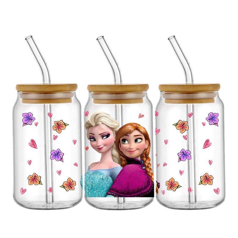 Disney Elsa Anna Princess Frozen Cartoon For Libbey Wraps 16oz Can Glass 3D Waterproof UV DTF Coffee Can Wrap Libbey Glass Wrap