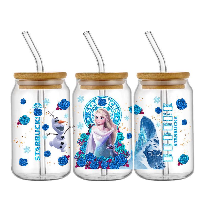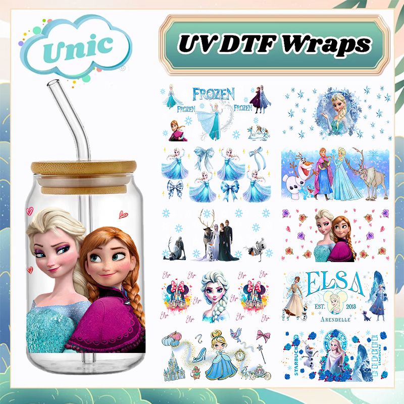 Disney Elsa Anna Princess Frozen Cartoon For Libbey Wraps 16oz Can Glass 3D Waterproof UV DTF Coffee Can Wrap Libbey Glass Wrap