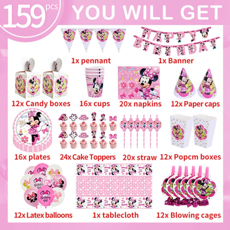 Disney Minnie Mouse Birthday Party Decoration Tableware Kit Hanging Banner Backdrop Balloons Supplies For Kids Party Supplies