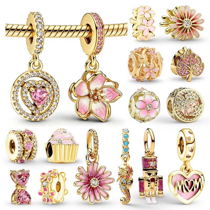 DIY Golden Women Jewelry Gifts Pink Flowers Charms Pink Daisy Flower The Nutcracker Cupcake Bow Beads Fit Original SankeBracelet