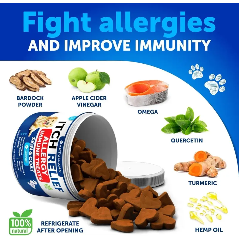 • formulated with love: we made chews for allergy relief for dogs itching with natural ingredients and free of added sugar, wheat, & corn. tasty dog skin and coat supplement is a great aid for dogs of all breeds & ages.