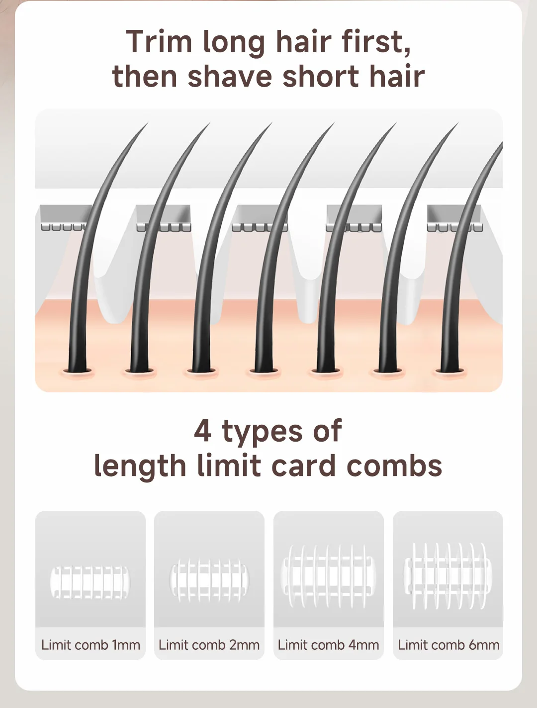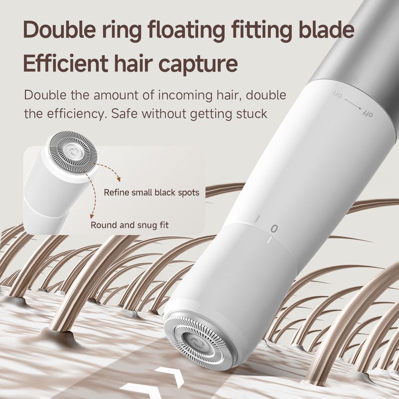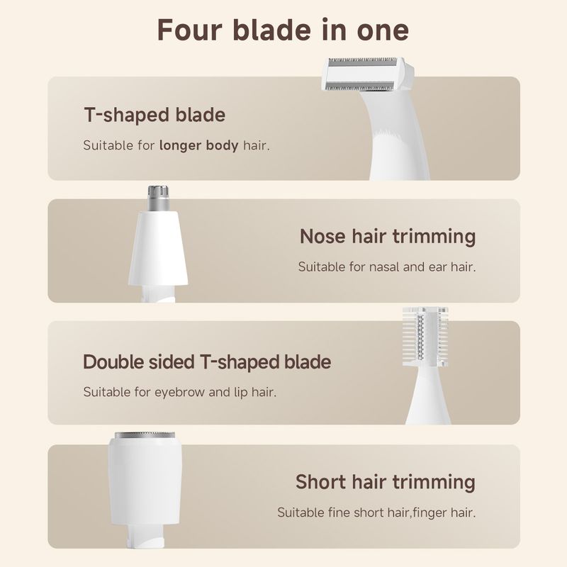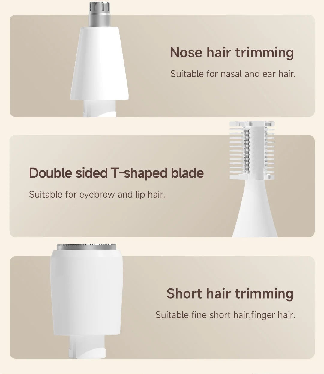 Product includes: main unit, shaving head, nose hair, sideburns, eyebrow trimming, brush, manual.