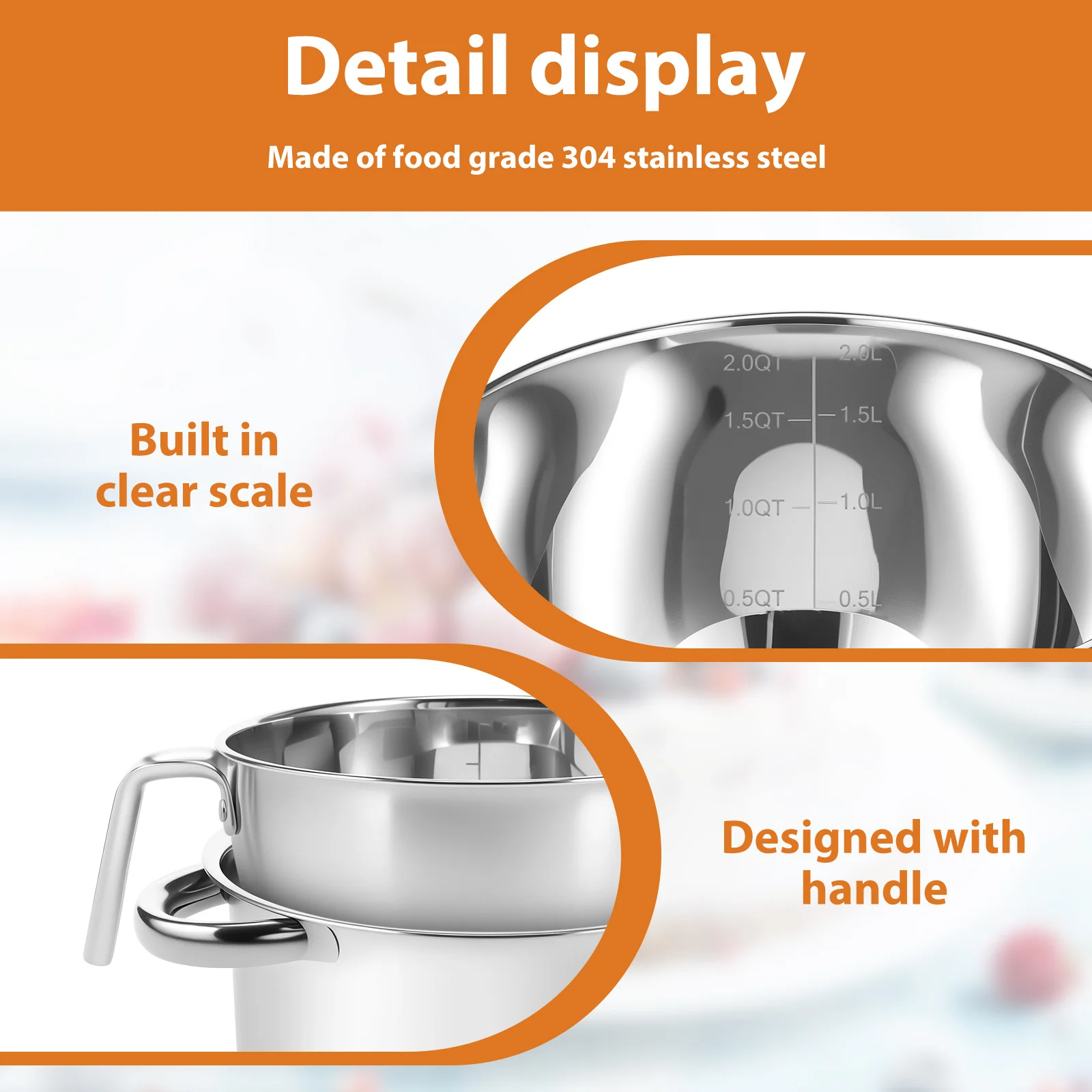 Easy to Clean: The double boiler pot set is easy to clean, and dishwasher safe, saving cleaning efforts. Note: It is recommended to scald the stainless steel utensils with boiling water before use, please wash thoroughly after use and keep it dry