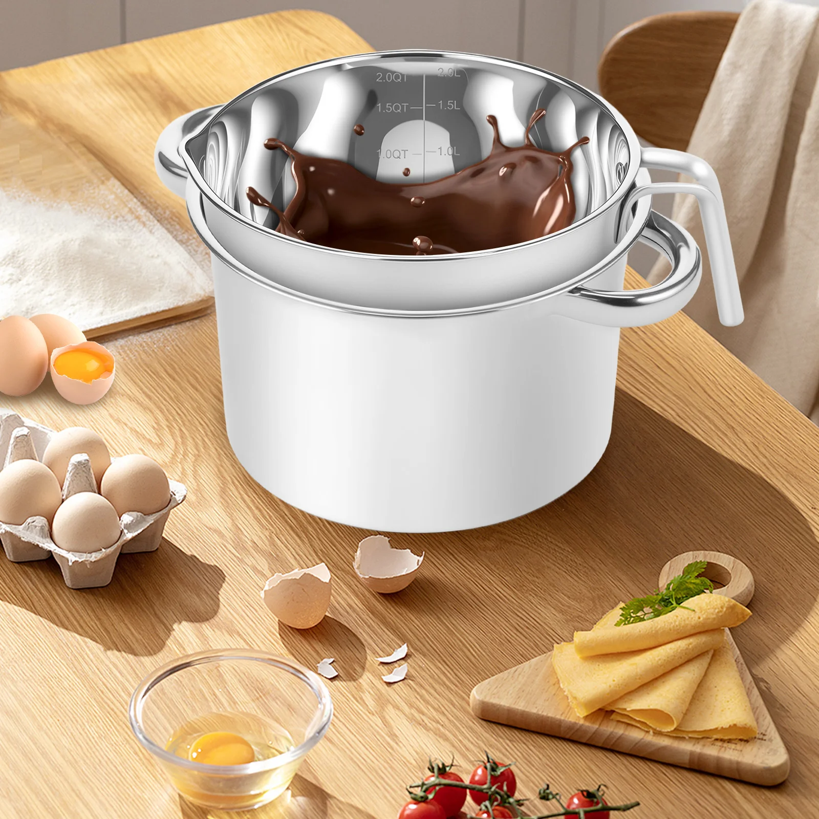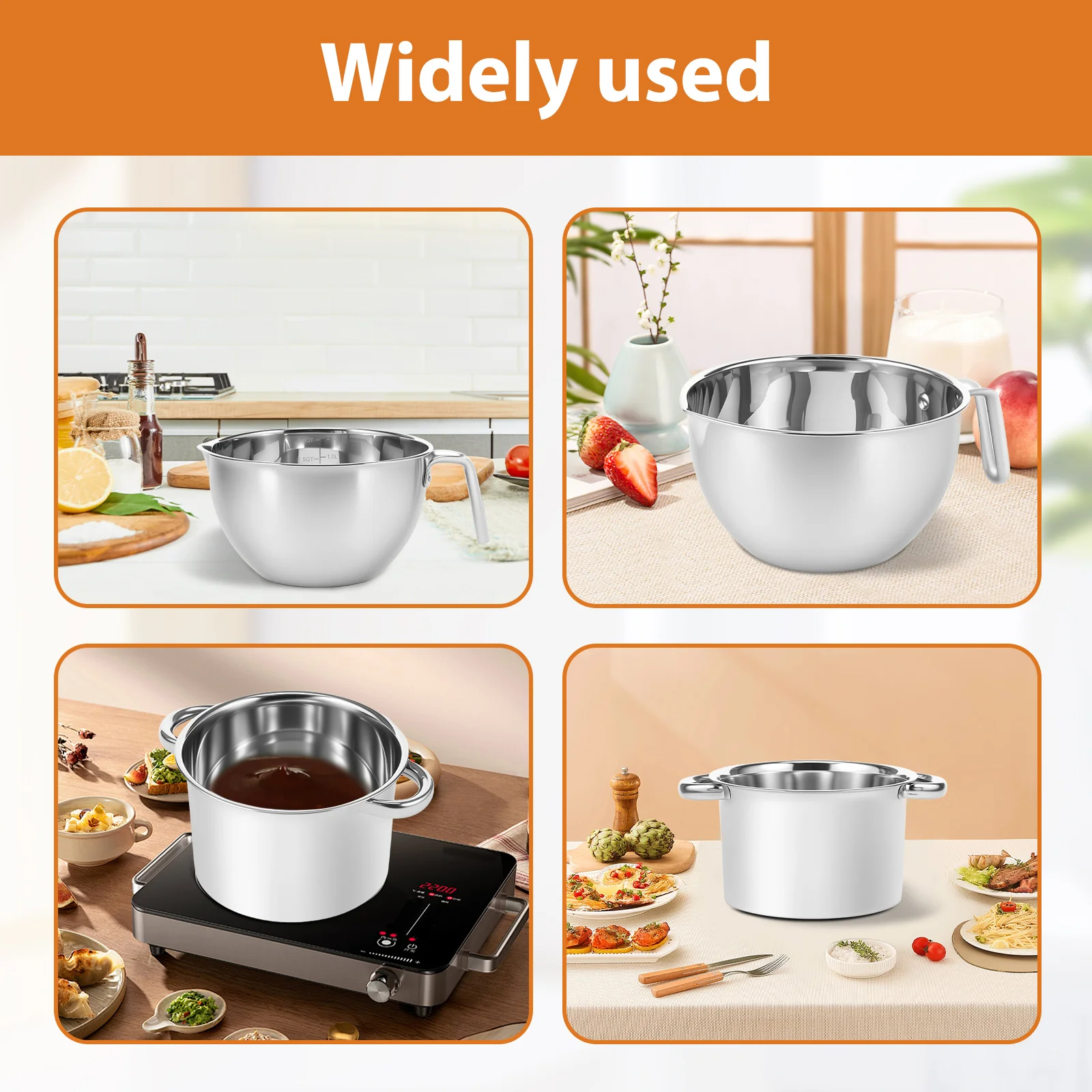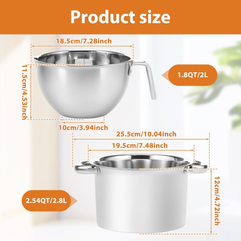 Package Content: This set includes a 1.8 quart inner melting pot and a 2.54 quart stainless steel double ear heating pot. Suitable for double boiling, the pots can also be used independently as saucepans, milk pots, noodle pots, or frying pans