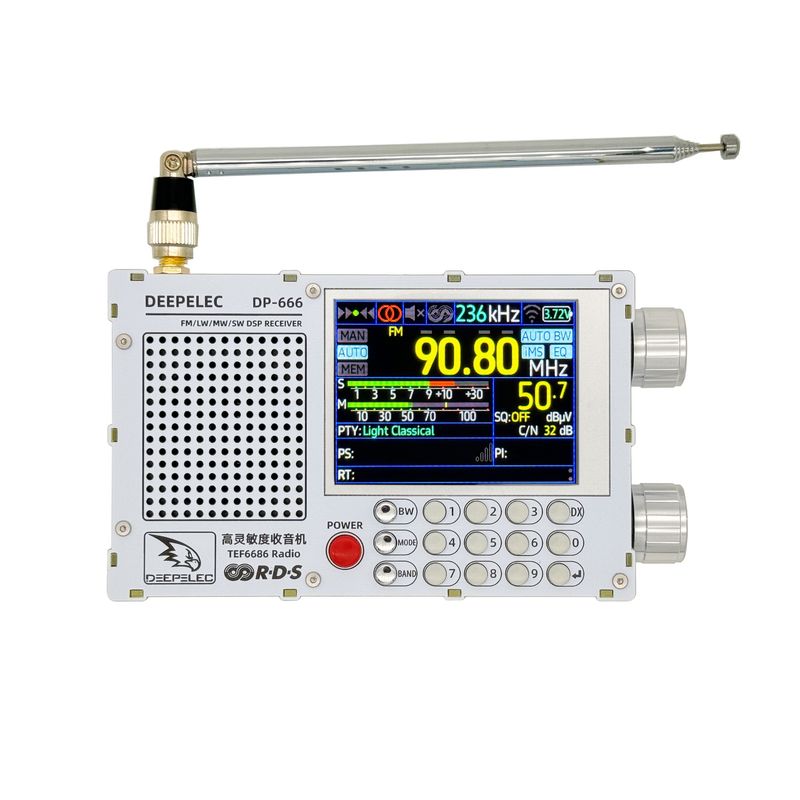 We redesigned the circuit board with reference to the mature TEF6686 front-end receiving circuit, and equipped the DP-666 with a 2.8-inch LCD color screen with resistive touch based on the open source project. While ensuring the portability of the machine, it can display rich RDS information (RDS information requires local radio support); a numeric keypad is added to facilitate users to quickly input frequencies; and a large-capacity 5000mAH battery supports longer standby time.