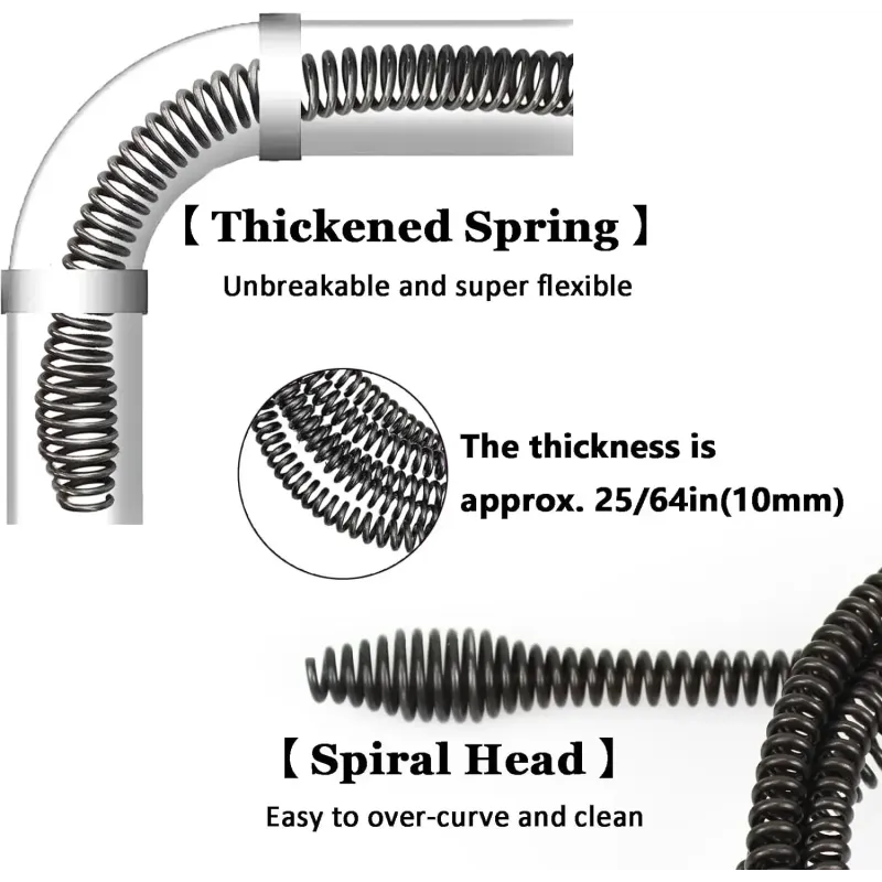 3. The flexible spring can be bent more than 90 degrees without breaking or kinking, which enables you to remove the sink clogs efficiently. After use, the springs can be stored in the drum to keep it tidier than conventional drain cleaner.
