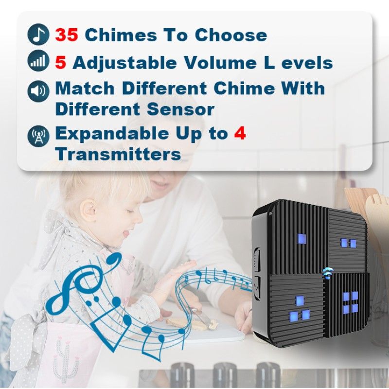 Fully Expandable System - The unit includes 1 plug-in receiver and 1 motion detecotor. Expandable up to 4 detectors and unlimited receivers for complete coverage of your outdoor/indoor properties. The receiver has 5 adjustable volume levels(includes mute mode) and 35 optional melodies. Match different melody with different motion detector around your property to differentiate where motion is being detected.