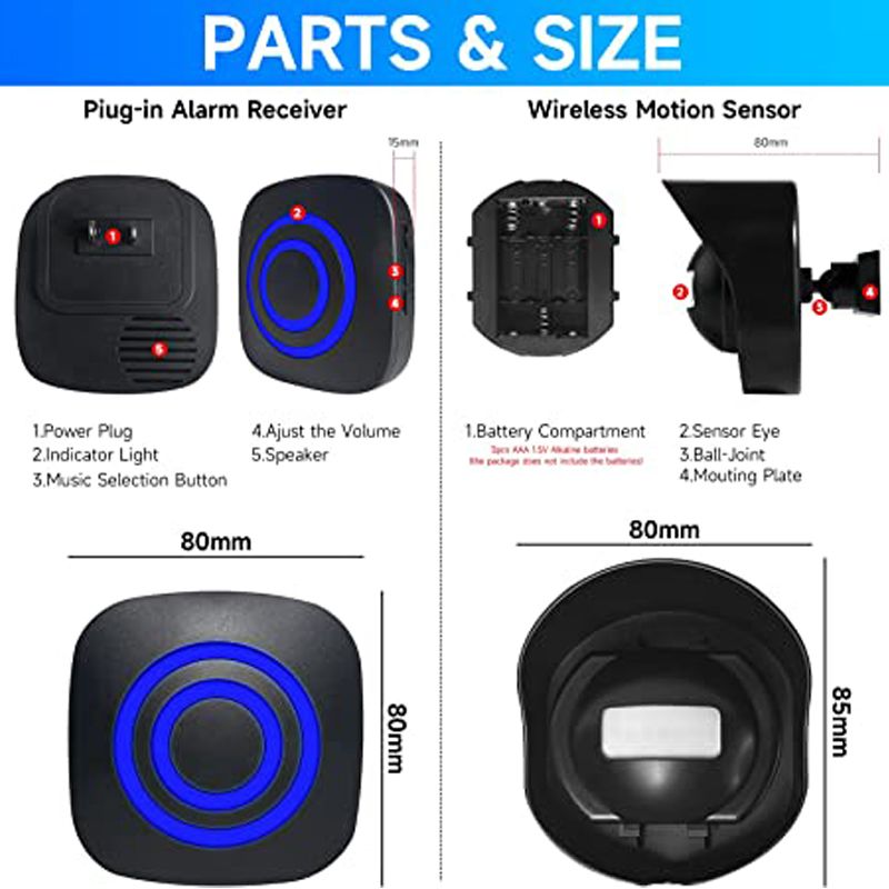 4. Easy to use: The unit can detect motion after the transmitter is installed in 30 seconds. When detected, it sends a signal to the receiver. The LED on the receiver flashes and the chime you select will sound. Wireless so there is no need for troublesome wiring work, and it is very convenient to install. With a single touch, you can use it with confidence knowing that you will receive calls and visitors