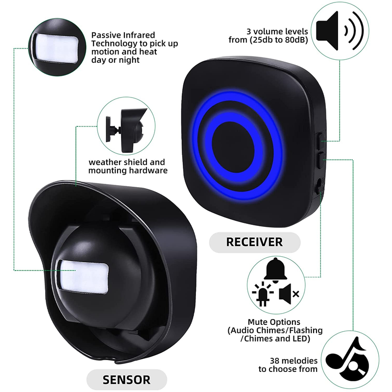 2. Equipped with high-sensitivity infrared sensor & increased detection distance: This is an outdoor model that can accurately detect objects with a detection distance of 26.4 - 59.2 ft (8 - 15 m), and the detection angle is 15 degrees up and down and 120 degrees left and right. Receiver volume is adjustable, 38 kinds of music optional, 4 volume control and LED indicator. You can set it with or without sounds (there is sound: sound + display light, silent: display light only)