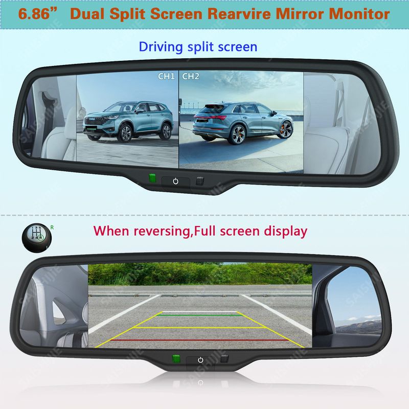🖥️【6.86 inch Dual Split Screen Mirror Monitor】 6.86-inch color IPS display, 2 video inputs, perfect combination with dual-lens reversing camera, split screen when you are driving, full screen when you are reversing