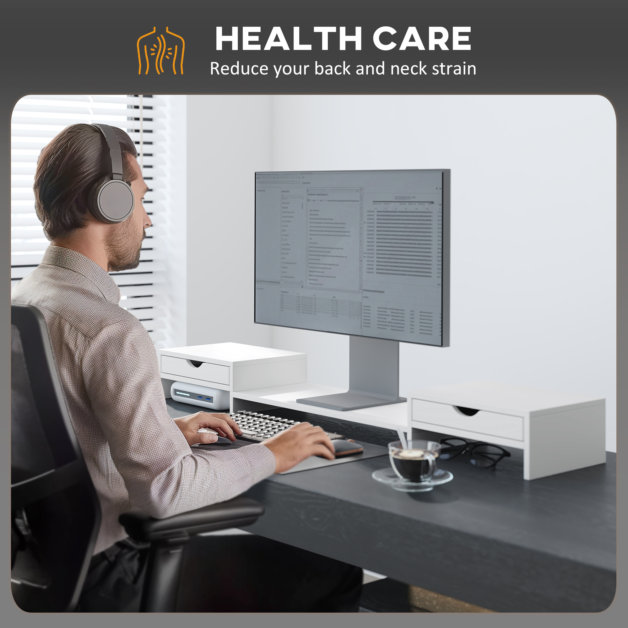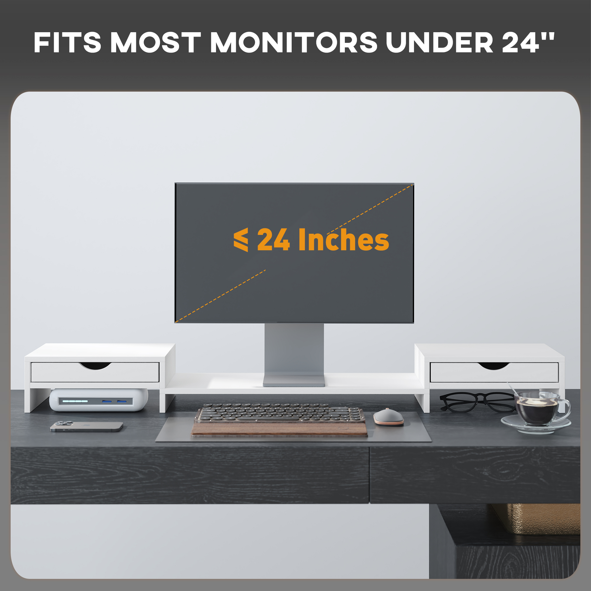 Elevate your viewing with the monitor stand with drawer, designed to lift your monitor to eye level for optimum comfort. This nifty monitor riser stand extends from 60-116cm to accommodate the placement of two monitors and adjusts angles to your liking, maximizing desk space with cleverly integrated drawers and storage compartments for keyboards and mice. Suitable for screens up to 24", it's a space-saver that tidies while it elevates!