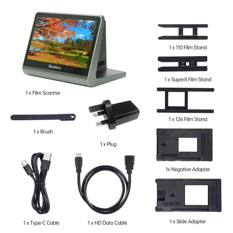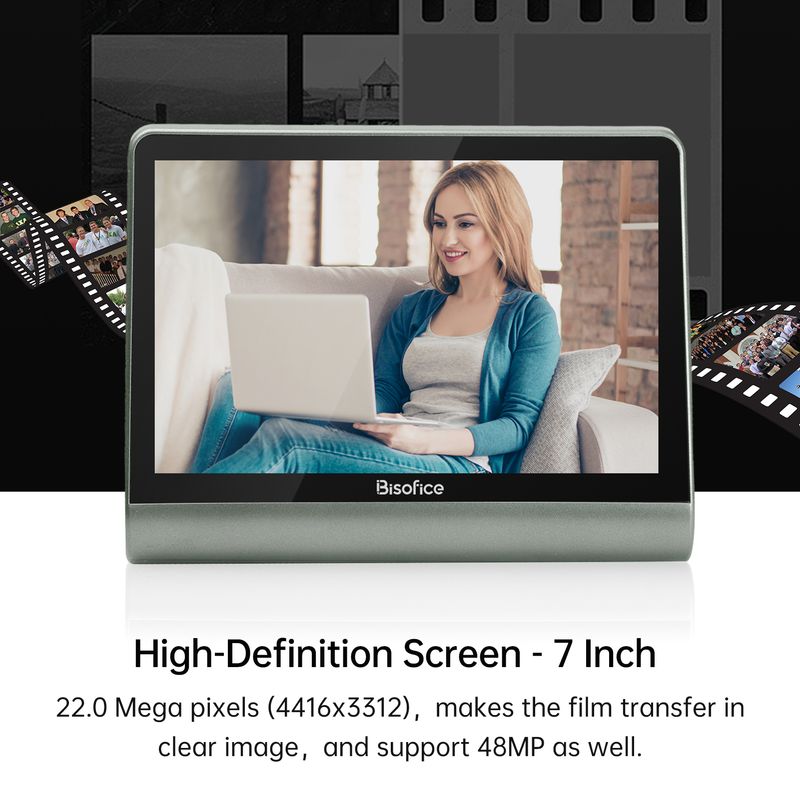 Bisofice Film and Slide Scanner for 135 Film(36*24mm)/126KPK /110 Film/Super8/ Monochrome/Slide to Digital JPEG Photos Built-in 16GB Memory 7'' LCD Screen Free APP Support 48W Pixels Display Connect w