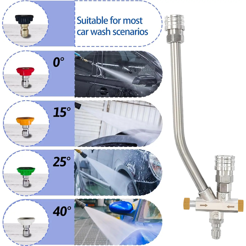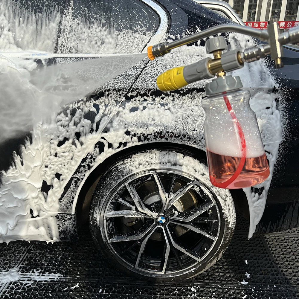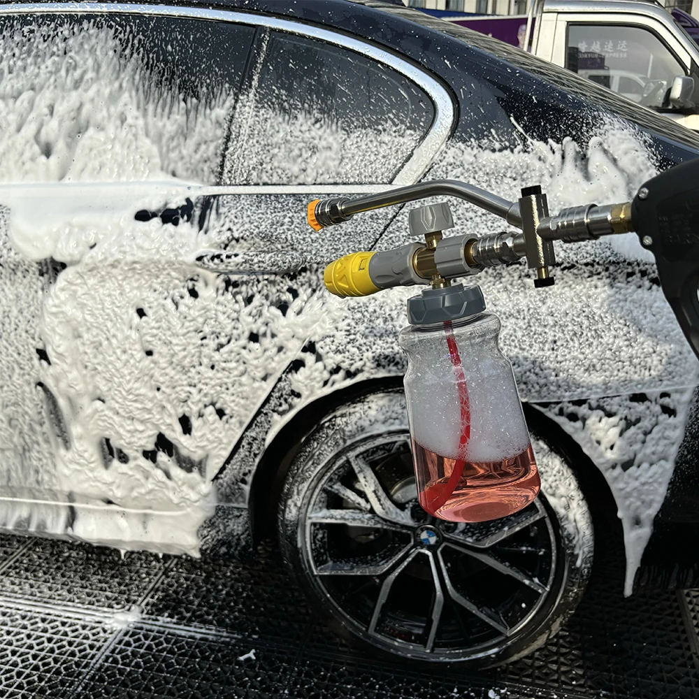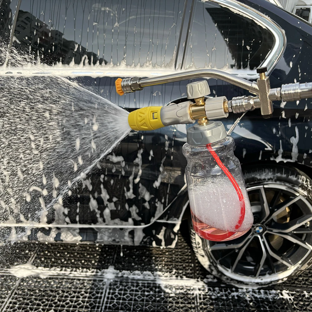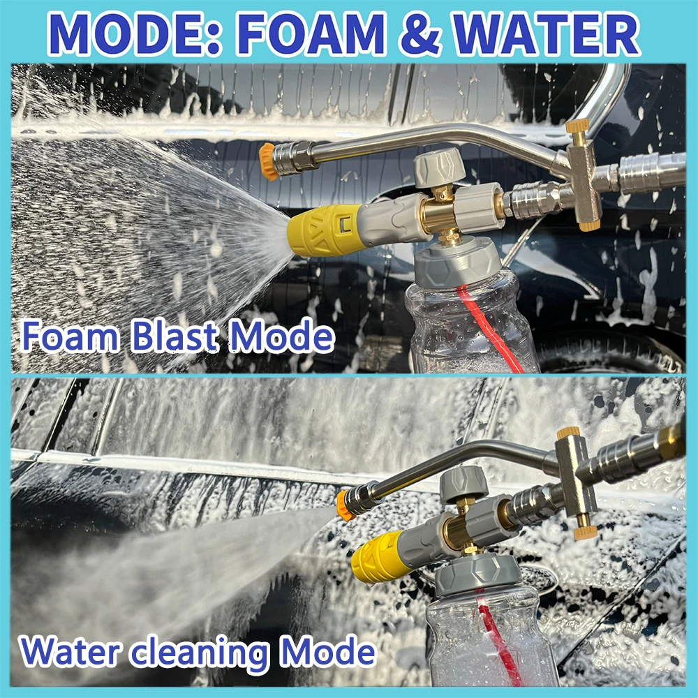 Transform your cleaning routine with our innovative foam blaster dual-connector accessory, designed to connect a pressure washer nozzle and snow foam canon simultaneously.