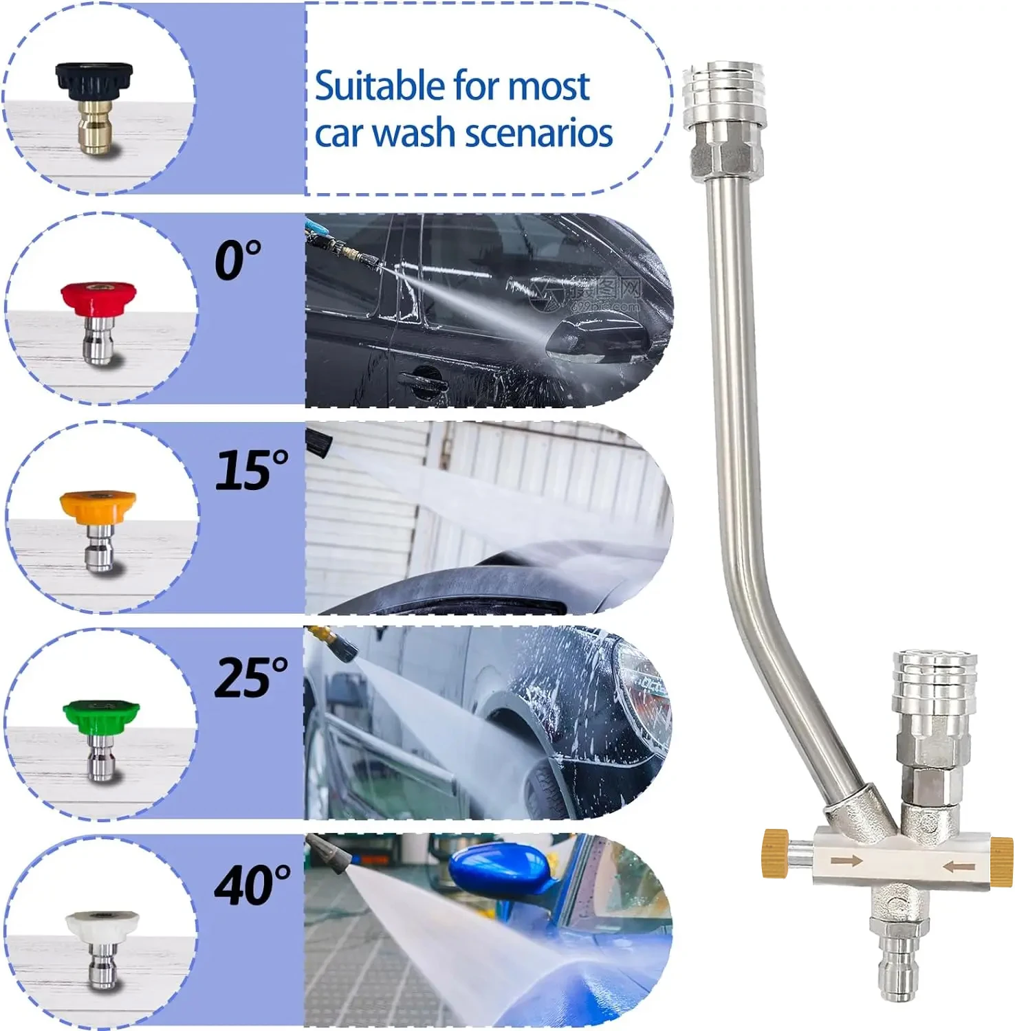 This versatile tool features a unique design with two different connector ends - a longer one for the power washer nozzle and a shorter one for the snow foam lance. This strategic arrangement ensures unobstructed water flow when using the nozzle, even with the foam dispenser connected.