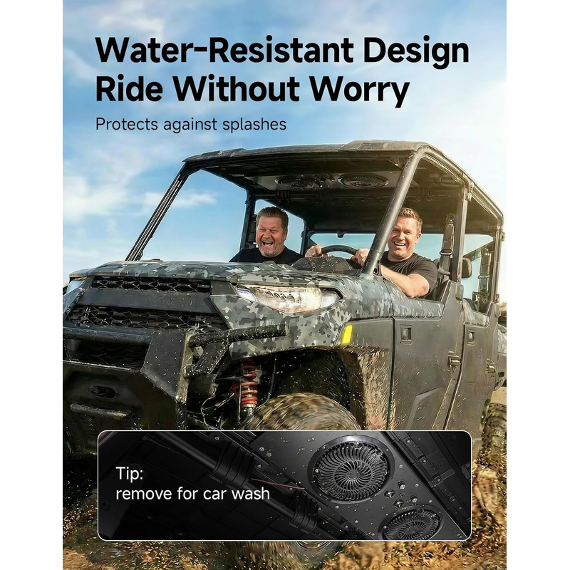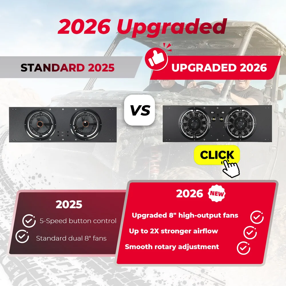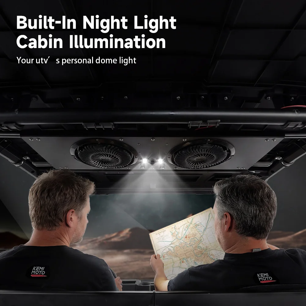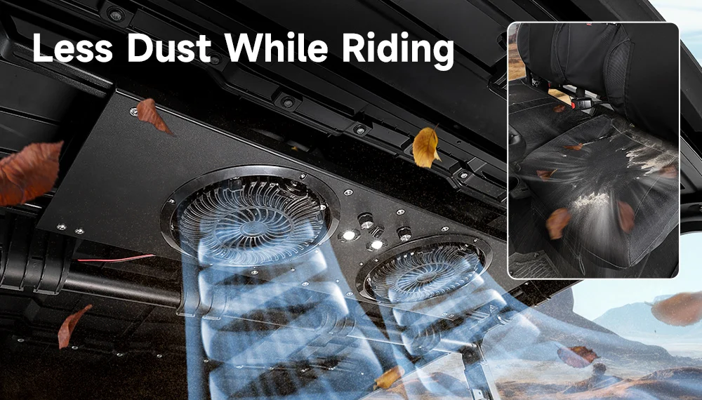 Two powerful 8-inch fans deliver up to 930 CFM airflow at 3000 RPM, powered by an 80W system with 6.6A operating current. The strong airflow improves cooling efficiency and helps push dust out of the cabin for a cleaner riding environment.