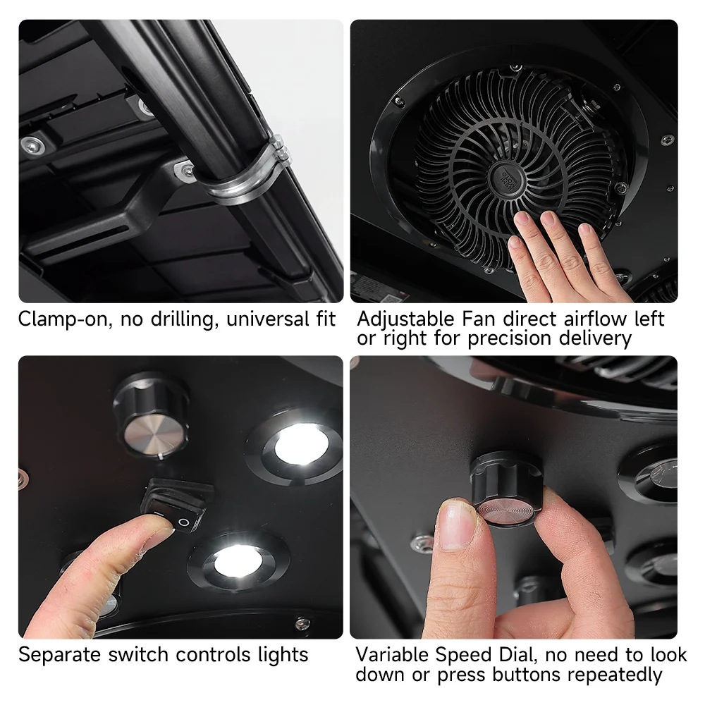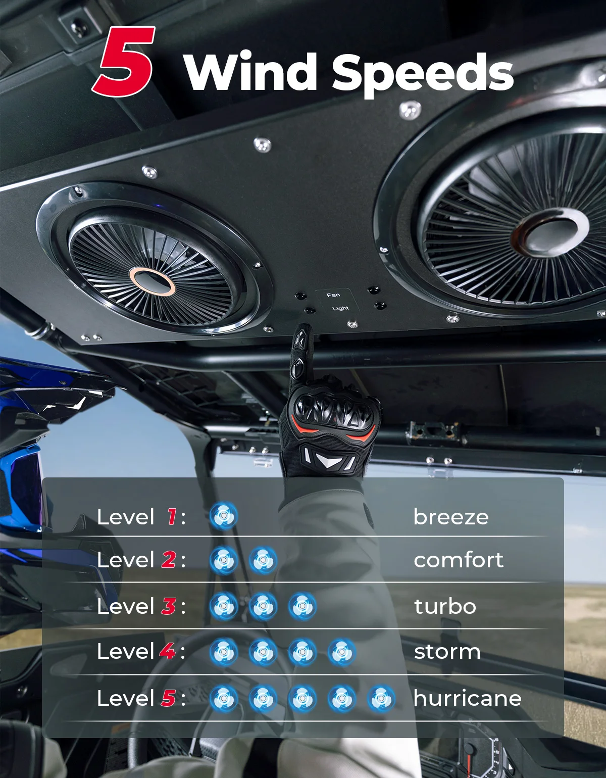 Dual fans generate airflow up to 5.9 MPH, delivering reliable cooling during hot summer rides and helping maintain comfortable cabin ventilation.