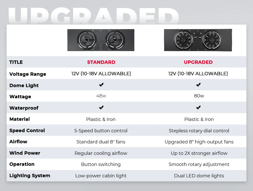 The upgraded version features two integrated white LED dome lights that provide brighter and more even cabin illumination. With an independent switch design, the lights can be used separately from the fan system, improving usability during night driving.