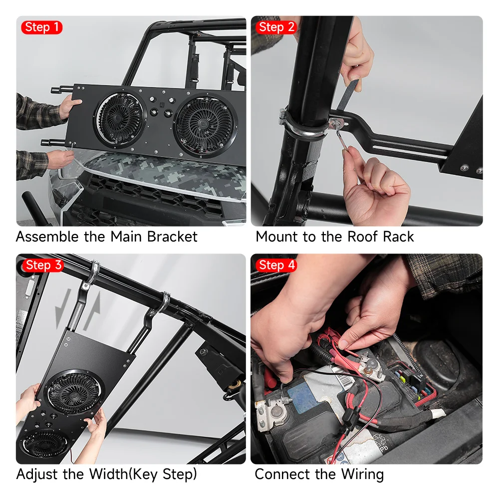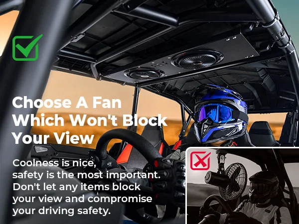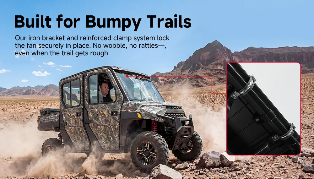 You can use the solid aluminum mounting bracket to install the utv cab cooling fan on the cab securely. Other parts of the fan are made of lightweight but sturdy ABS plastic, make sure the fan won't get loose or wobbly, even on bumpy roads