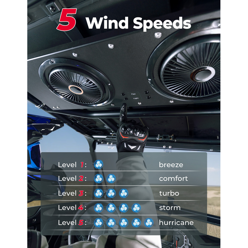 Dual fans generate airflow up to 5.9 MPH, delivering reliable cooling during hot summer rides and helping maintain comfortable cabin ventilation.