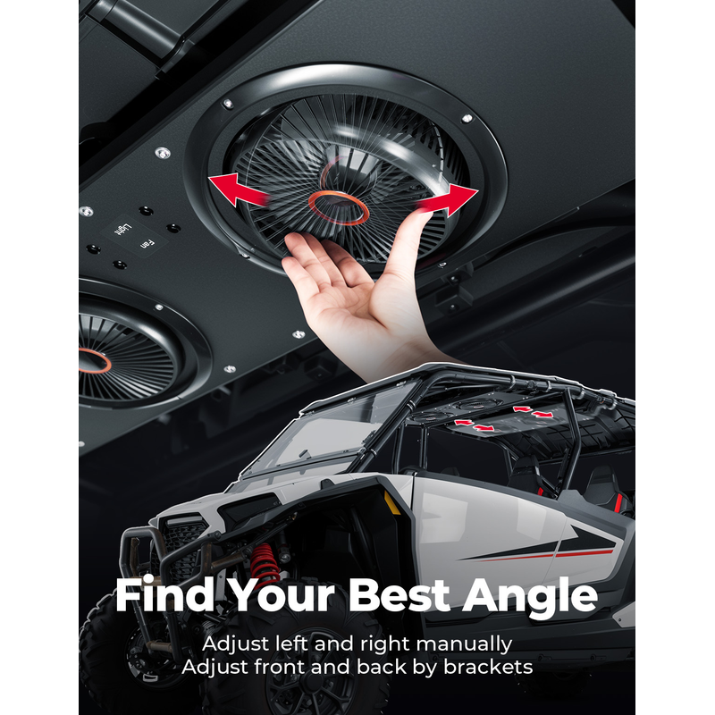 You can use the solid aluminum mounting bracket to install the utv cab cooling fan on the cab securely. Other parts of the fan are made of lightweight but sturdy ABS plastic, make sure the fan won't get loose or wobbly, even on bumpy roads