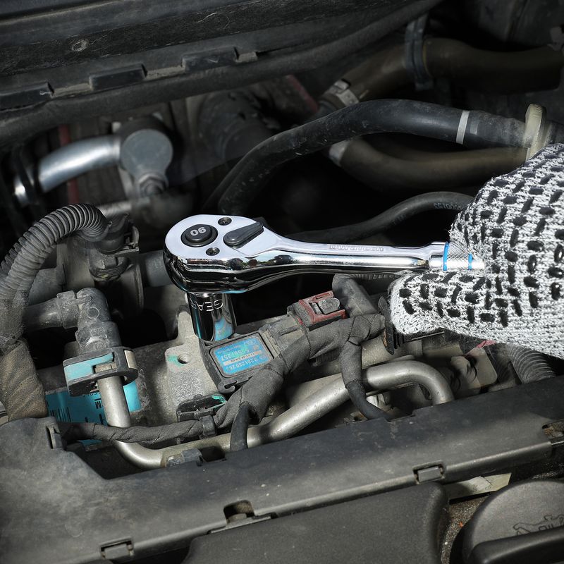 With just 4 degrees of space needed for each turn, it not only gets the job done faster but it's essential for working in narrow spots. Precision engineered high strength pawl for increased durability. Pressing the release button on the socket is easy to remove and even makes one-handed socket changes possible