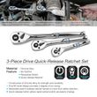 This 3-piece 90-Tooth ratchet set offers 1/4 inch, 3/8 inch and 1/2 inch drive. Full polish chrome finish easily wipes clean and resists corrosion