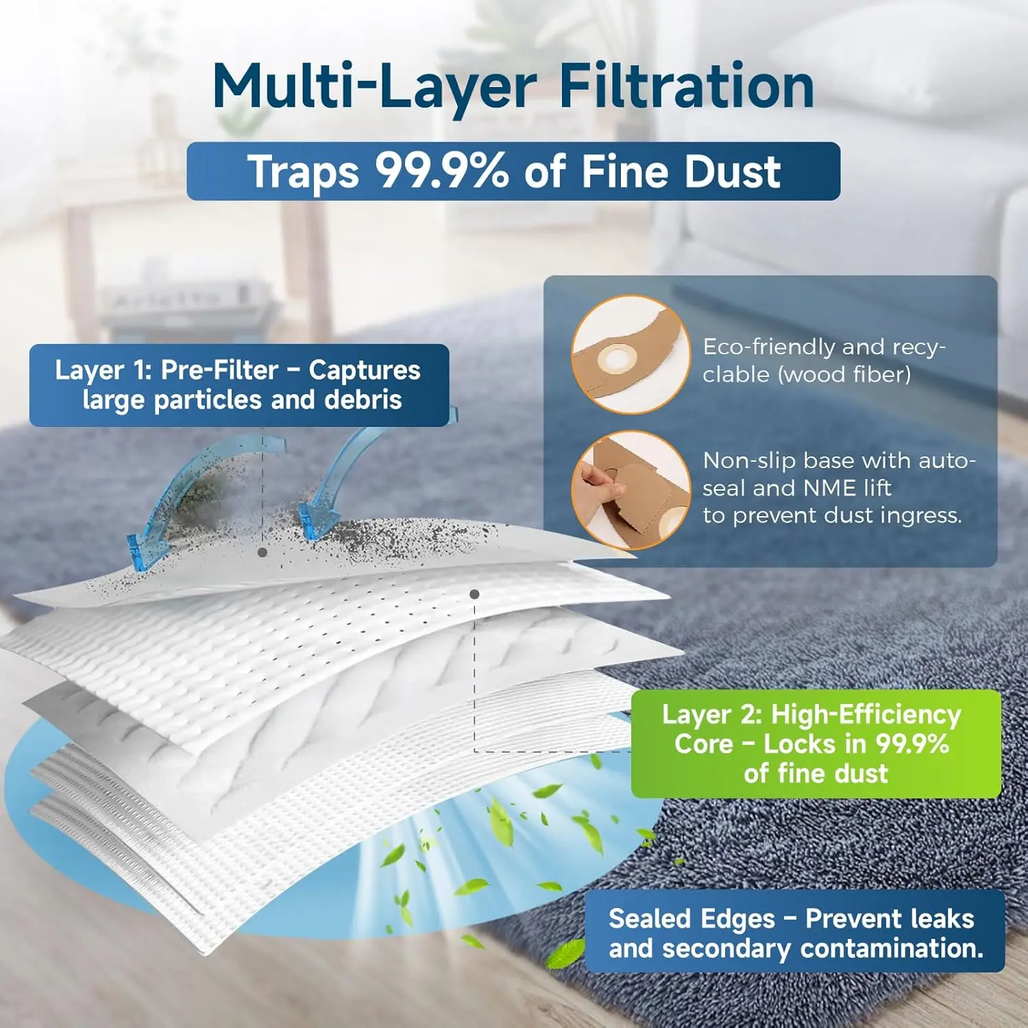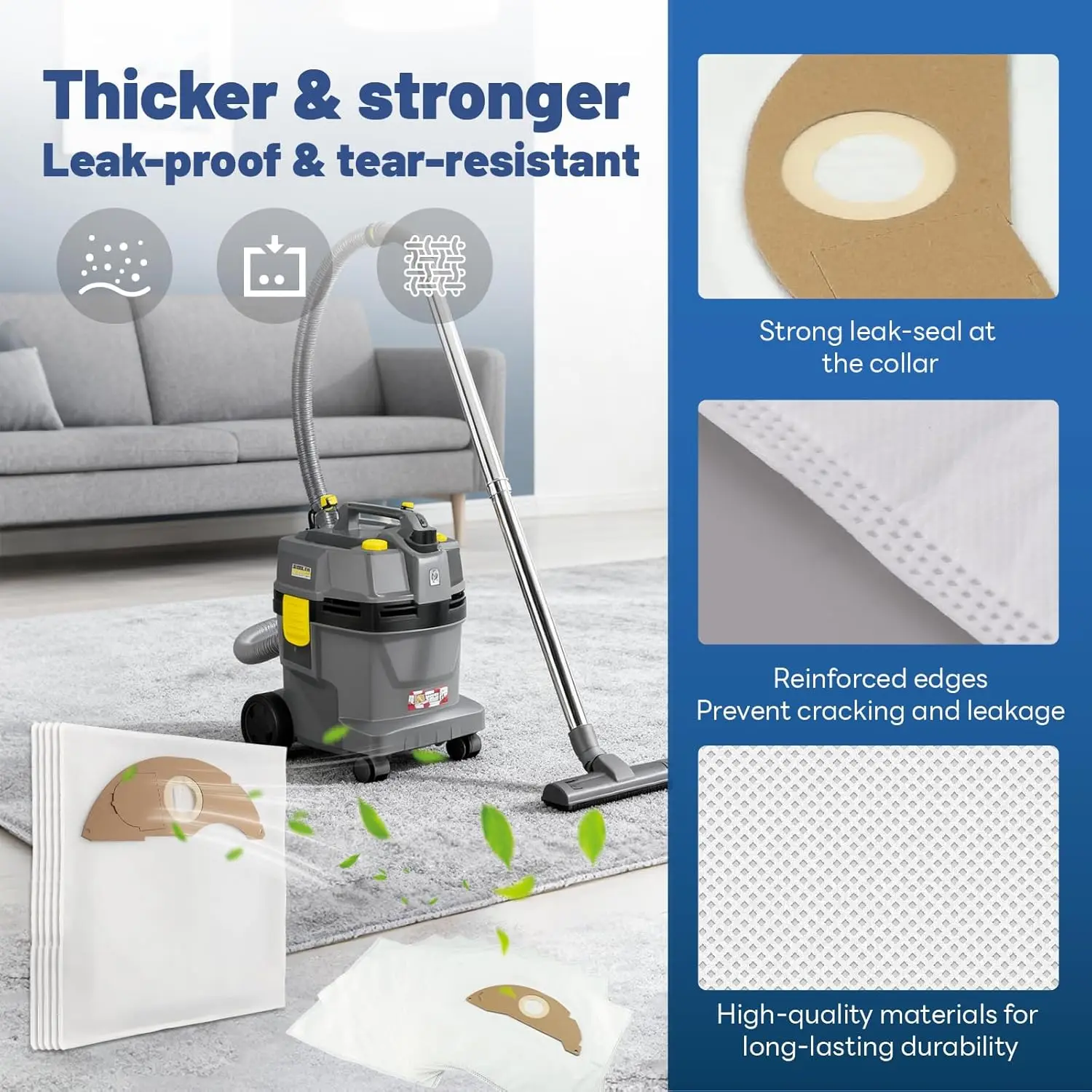 • 【Easy installation】 The vacuum cleaner replacement parts for Kärcher NT 22/1 perfectly matches the original dimensions of the vacuum cleaner. With its non-slip top edge, replacement is simple: pull up to remove the old bag, then slide the new one into the slot. Quick and practical, your vacuum cleaner regains its optimum performance.