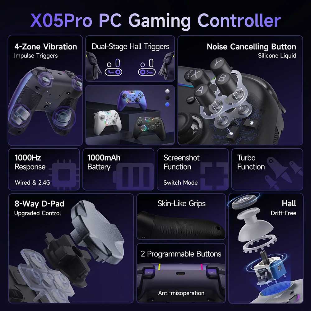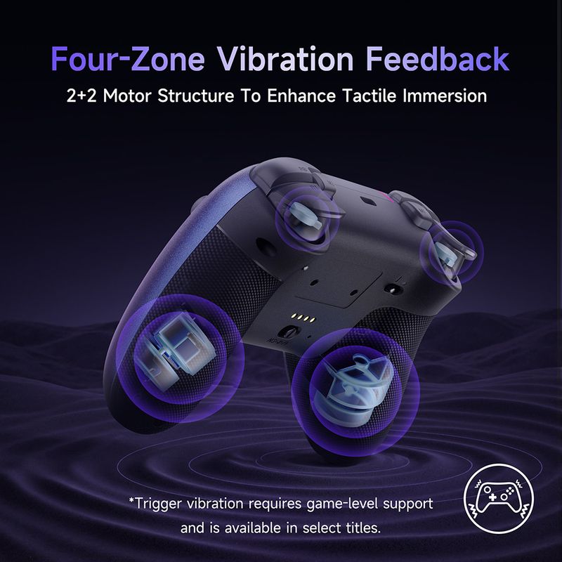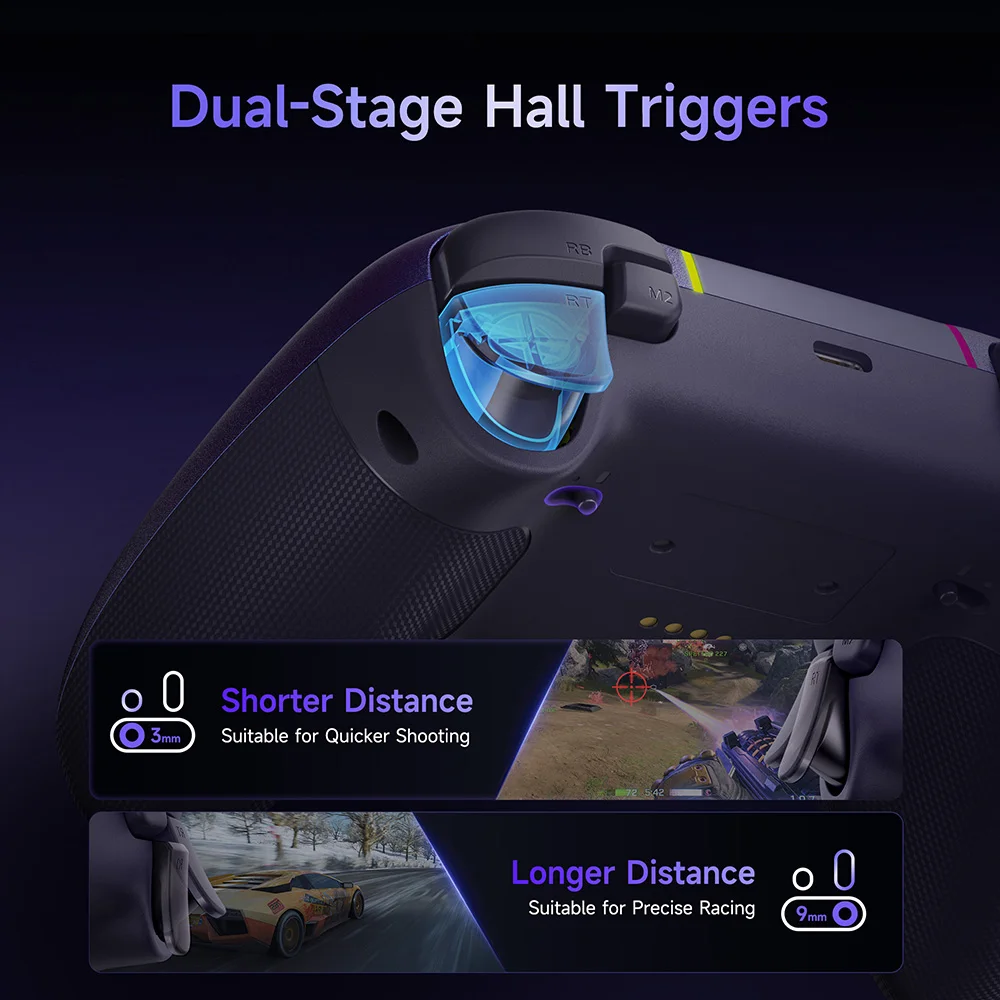 Two-stage trigger locks adapt to FPS or racing titles, while dual rumble motors in triggers generate lifelike recoil, collision and drift feedback for deeper immersion.