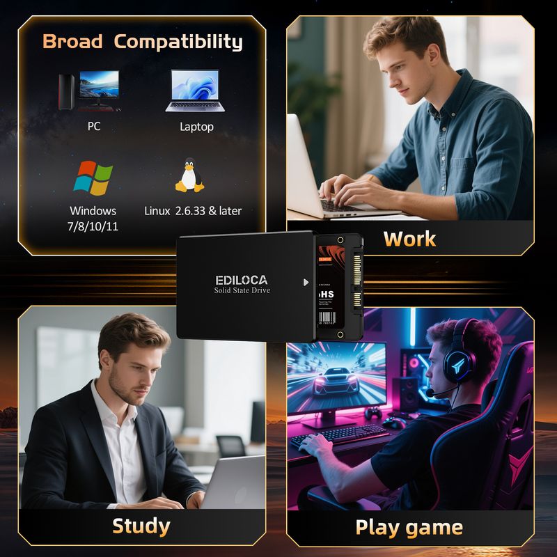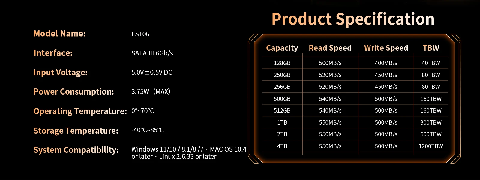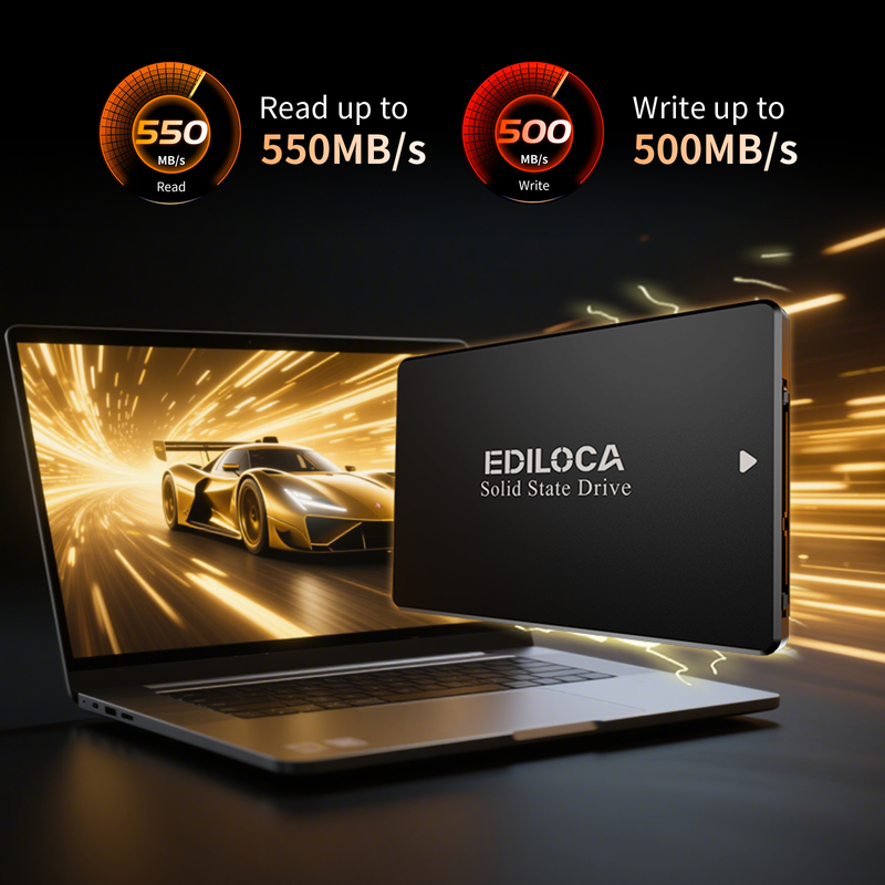 3.There is no mechanical structure inside the Ediloca ES106 Internal SSD,which makes it shockproof,solid and quiet.At the same time,high-quality 3D NAND flash memory particles are used to effectively reduce the operating power consumption of Intern al SSD and prolong the service life.