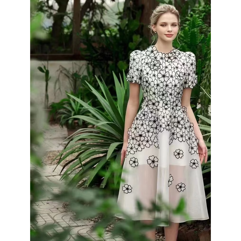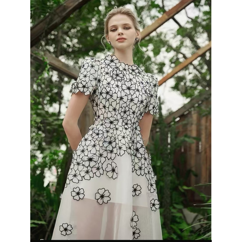 Ele 3D Floral Embroidery Evening Dr Women's Slimming Waist Euro Organza Net Skirt Long Dr Holiday Dr Women
