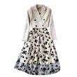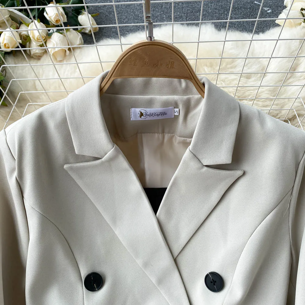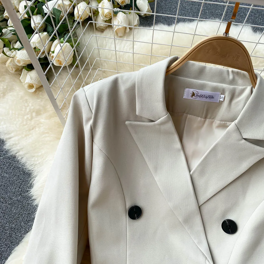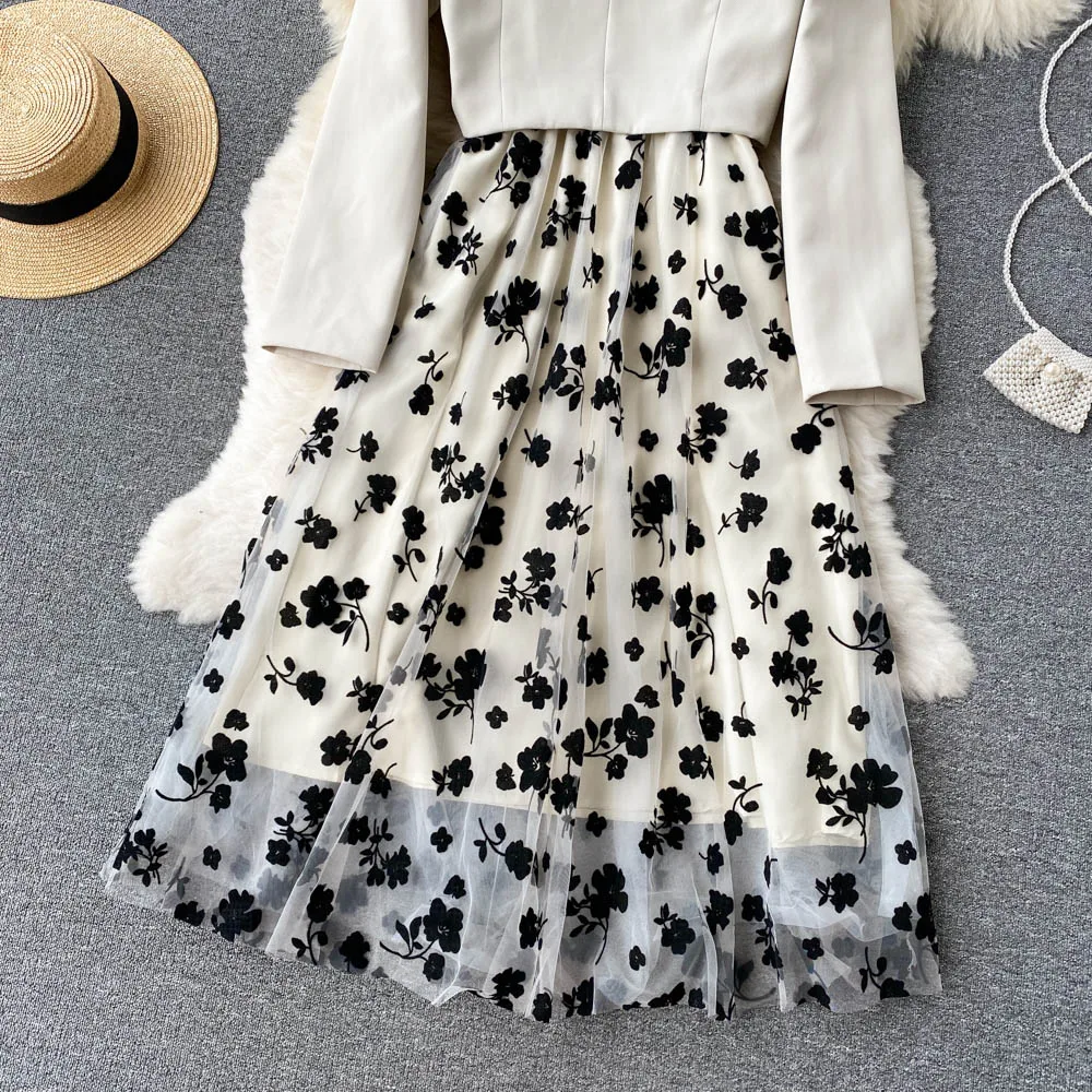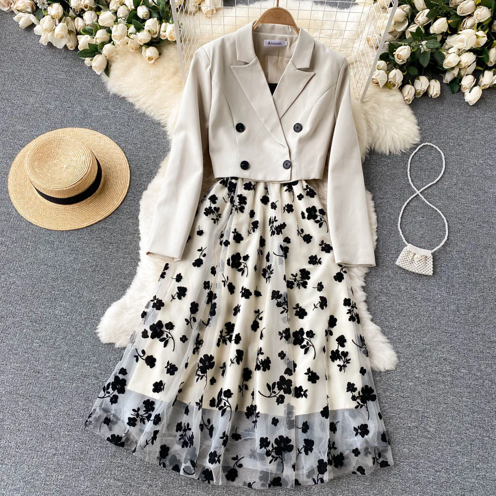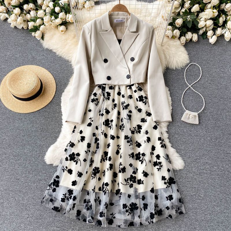 This ensemble exudes French sophistication with its short double-breasted blazer and chic mesh dress, perfect for the fashion-forward woman.