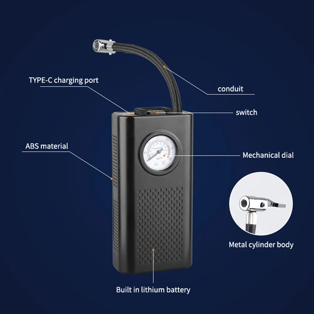 Electric Air Compressor USB Charging Motorcycle Tyre Inflator Multifunctional Electric Tire Pump for Motorbike Auto Bicycle Specification: Origin: Mainland China Main Material: ABS Color: Black Size: About 16.2cm (6.38in)*8.5cm (3.35in)*4.8cm (1.89in) Net Weight: About 442.5g Charging Method: Type-C USB Charging Product Battery: 3000mah Applicable To: Schrader Valve Rated Power: 80w
