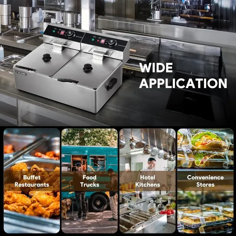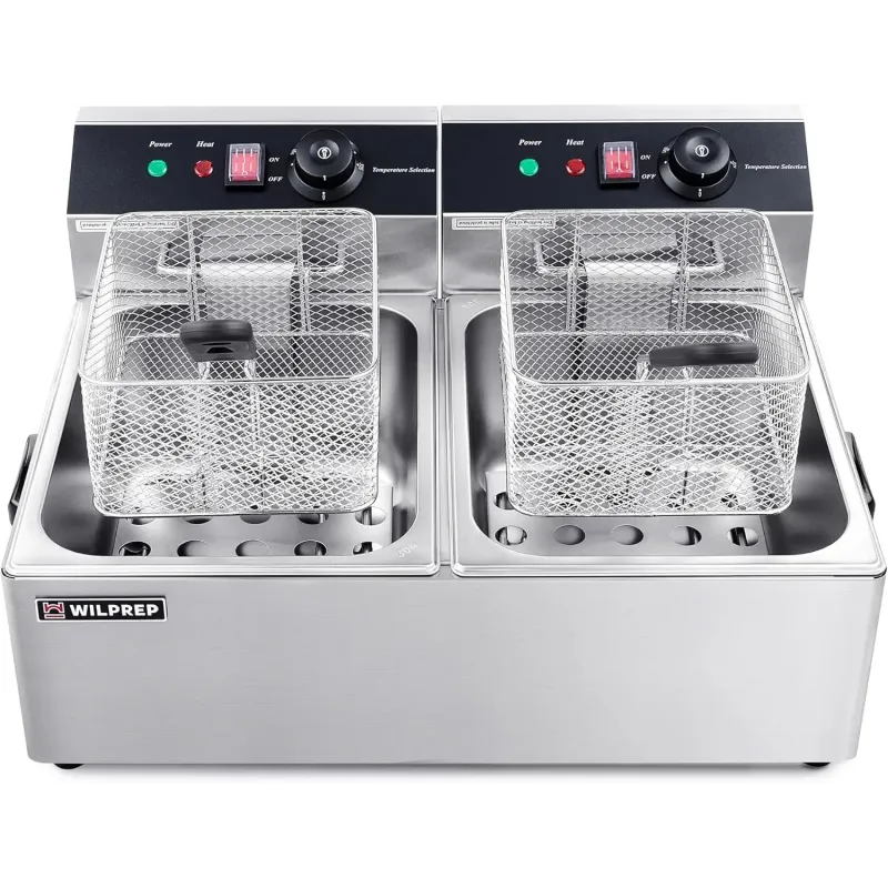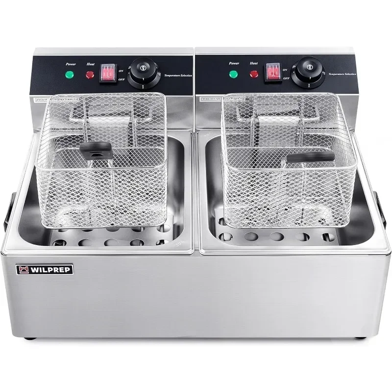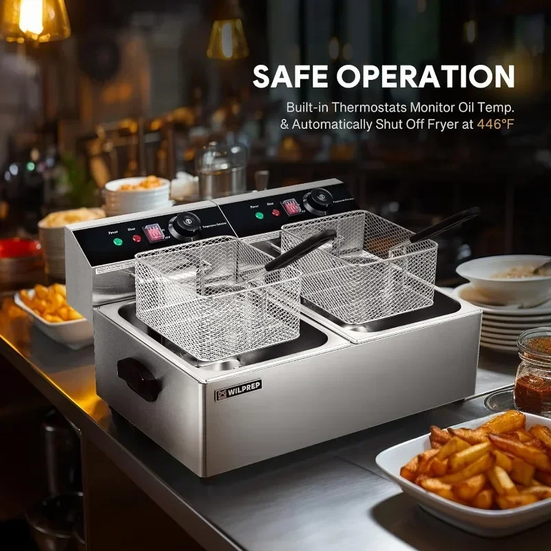 • Commercial Deep Fryer: Equipped with two powerful 1600W heating units, Wilprep's countertop deep fryer is tailored to boost efficiency, making it perfect for buffet restaurants, food trucks, delis, and more